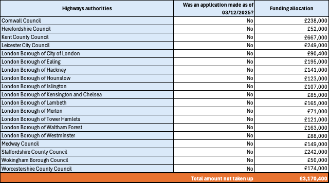 However, in response to a Freedom of Information request submitted by The Fast Charge, the Department for Transport confirmed that 19 authorities had not applied as of 3 December, leaving almost £3.2 million of the pot untouched.