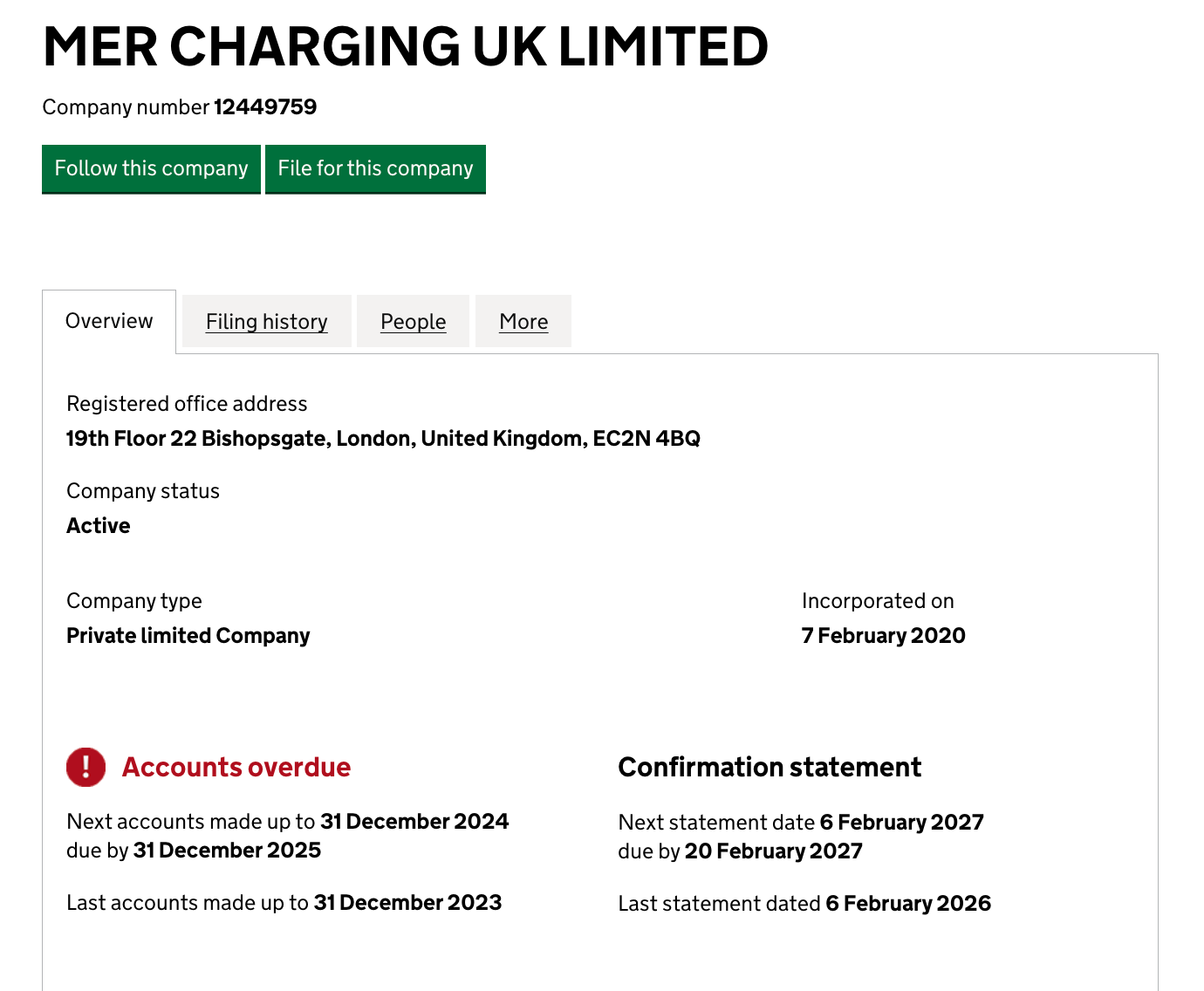 Details are quite light... However, the fact that Mer’s UK annual accounts are now more than a month late has fuelled speculation about the company's future. In the last published accounts, which went up to December 2023, Mer Charging had identified liquidity as a principal risk. In the accounts, it said Mer’s parent company had a “present intention to provide financial support for at least one year after the date that these financial statements are signed for.” They were signed in September 2024, so quite a while back now.