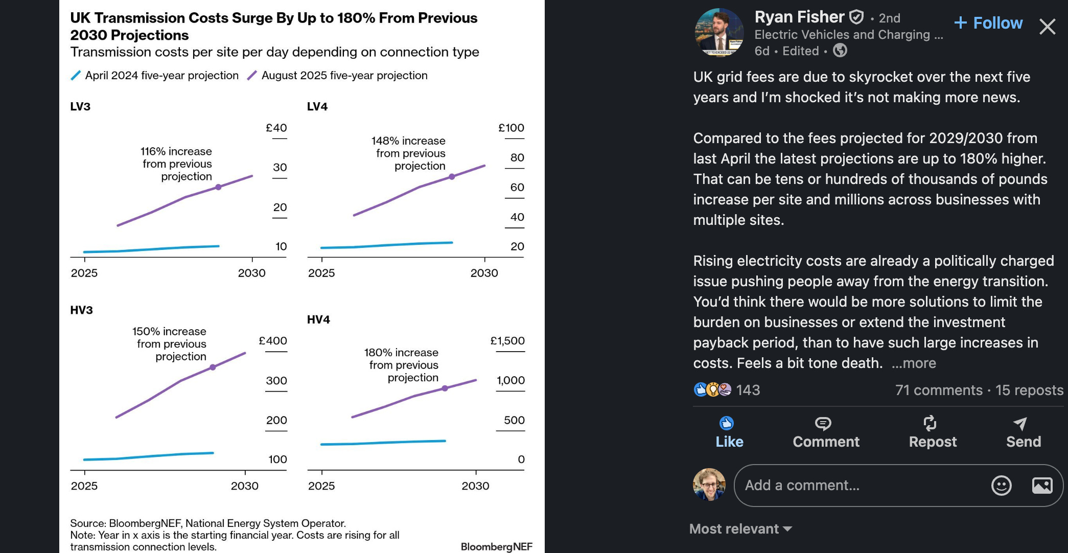 As a final policy to go in the ugly column: reducing standing charges and grid fees. A recent report by Bloomberg revealed that fees projected for 2029/2030, as of last April, are up to 180% higher compared to the latest projections. This follows a recent ChargeUK report that suggests standing charges have grown 462% in some cases in two years.