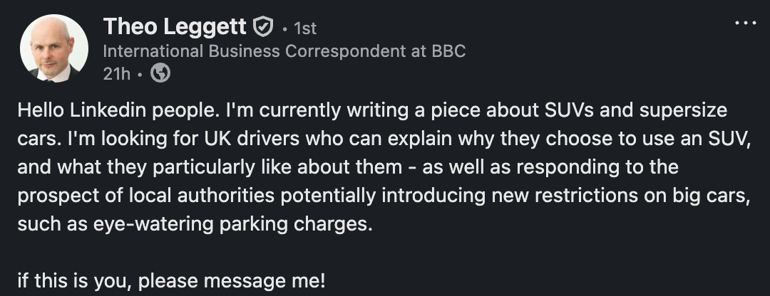 At present, there is talk that the pricing will be set between 3p and 9p for every mile driven, depending on how much a car weighs. Given this week, the BBC’s Theo Leggett was looking for case studies on ‘people who own SUVs’, I do wonder if the Beeb is preparing for a story like this.