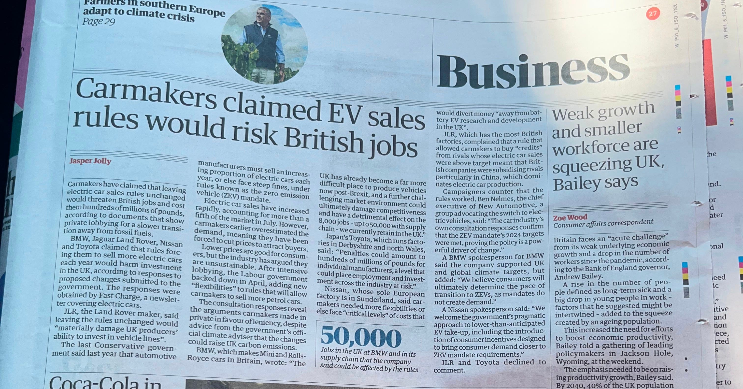 Headline: Over the weekend, The Guardian reported exclusively on my findings from obtaining more than 130 pages of carmaker responses to the most recent ZEV mandate consultation. These responses led to more flexibility being announced by the Prime Minister in April to support car manufacturers in hitting EV sales trajectories.