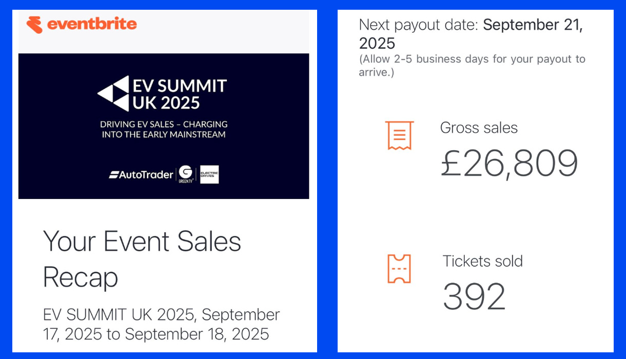 New payment: In addition to the alleged transfer of funds, The Fast Charge is also today publishing evidence that a £26,809 payment was made to Green.TV on or after 21 September. This was money from ticket sales via Eventbrite from those attending the EV Summit. Employees have claimed this money might have helped cover wages. However, given the timing of this payment, it also raises questions about whether it was included in the company’s final Statement of Affairs, filed by Ade three days before the money was due to arrive.