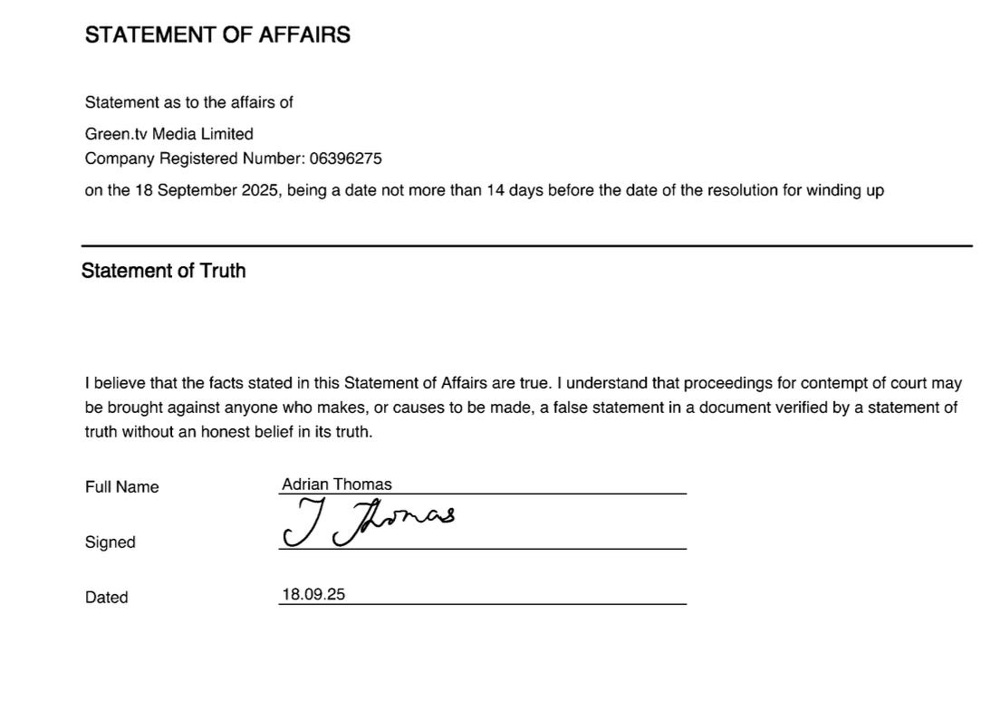 More detail: The final accounts and list of creditors are detailed in a ‘Statement of Affairs’ which was filed by Ade Thomas, the sole director of Green.TV Media Limited, on 18 September this year, the final day of the EV Summit, where, shortly thereafter, news of the impending liquidation became apparent to employees. This new document was only published after the appointment of the liquidator, Arafino Advisory, who signed the document off on 30 September. See Companies House here.
