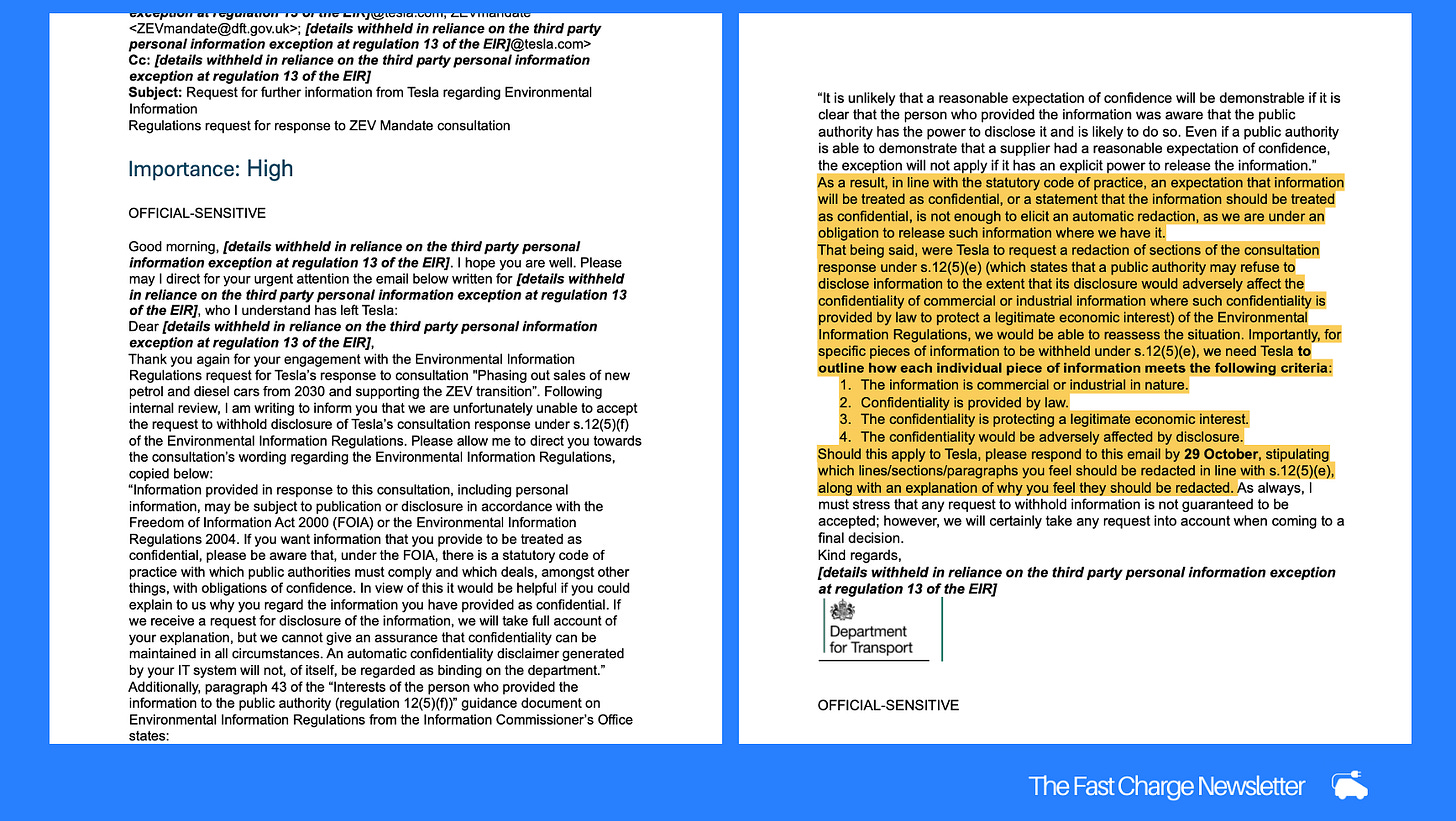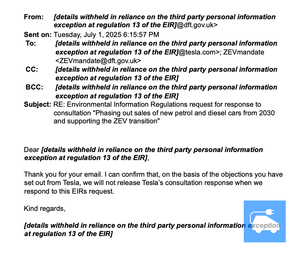 For example... After Tesla initially objected to releasing their entire response, an unnamed DfT official appears to have simply accepted the company’s argument without any pushback. In a two-sentence email in July 2025, they confirmed that Tesla’s response would not be released.