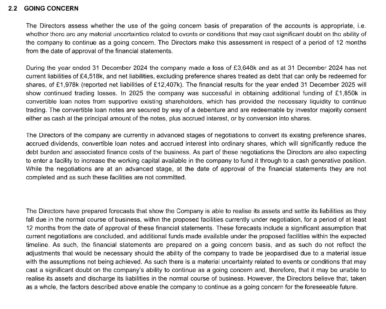 “The directors of the company are currently in advanced stages of negotiations to convert its existing preference shares, accrued dividends, convertible loan notes and accrued interest into ordinary shares, which will significantly reduce the debt burden and associated finance costs of the business. As part of these negotiations the Directors are also expecting to enter a facility to increase the working capital available in the company to fund it through to a cash generative position. While the negotiations are at an advanced stage, at the date of approval of the financial statements they are not completed and as such these facilities are not committed.” [Page 4, Zapmap accounts published 19 Feb 2026]