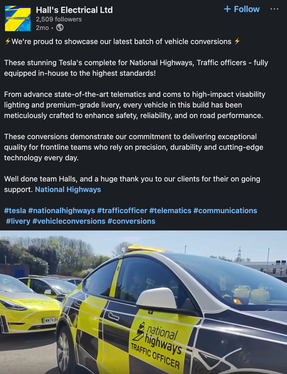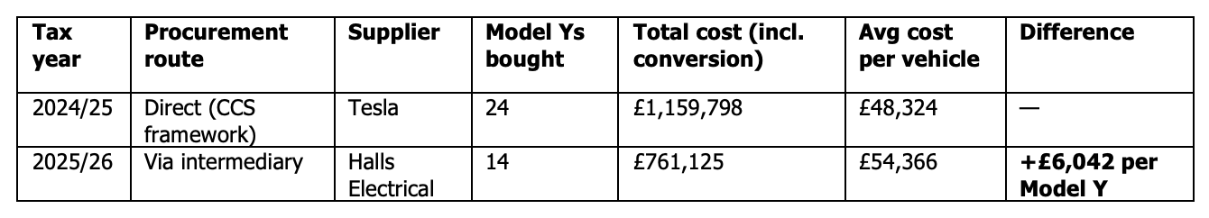 Halls Electrical is a listed vendor on the CCS framework. They are registered on the list for converters of ‘Bespoke and Specialist Vehicles’. While procuring vehicles this way is permitted under framework rules, as Halls Electrical has no formal arrangement with Tesla, and is understood to simply be a customer who takes delivery of cars, it’s likely they were bought closer to or at retail prices. This would explain why these 14 vehicles, including their conversion, cost National Highways £761,000. Aka... £54,366 per car compared to the previous £48,324.