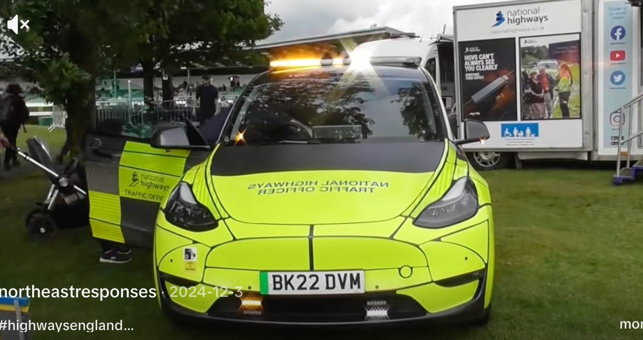 Background... Over Christmas, probably like many of you, I spent a lot of time on the motorway. And, on a journey back to London, as the horizontal sunshine finally dipped behind a tree, I was able to make out a Tesla Model Y in National Highways colours. It was a traffic officer vehicle, and it was the first I’d seen.