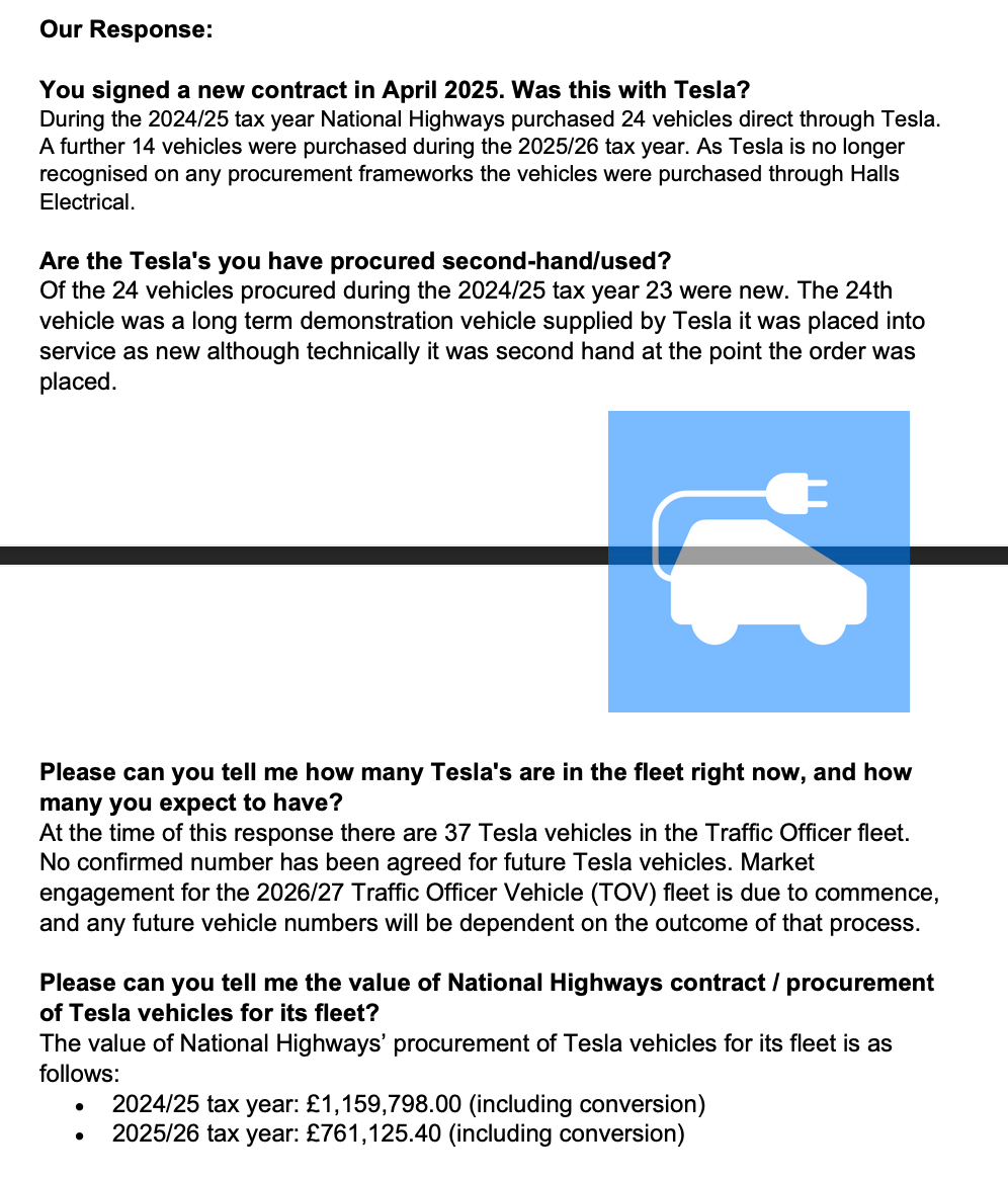 “During the 2024/25 tax year National Highways purchased 24 vehicles direct through Tesla. A further 14 vehicles were purchased during the 2025/26 tax year. As Tesla is no longer recognised on any procurement frameworks the vehicles were purchased through Halls Electrical.” — From FOI (Pictured below)