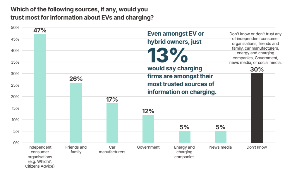 Worryingly for Whitehall... Given how many see them as responsible, when the public was asked about which sources they trusted most for information on EVs, only 12% mentioned the government or public bodies. This is concerning given the large communications campaign currently being led by the Department for Transport. In February, DfT told The Fast Charge that its campaign is multi-channel, but it would be interesting to know where exactly their messages are appearing.