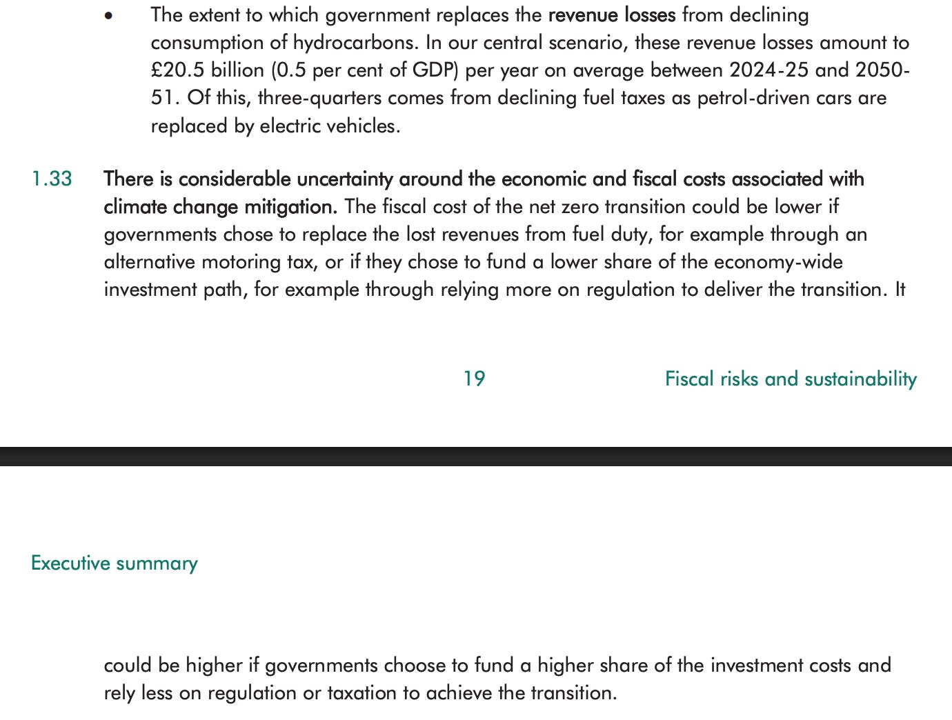 In a bleak July update which looked at current pressures on public finances, the OBR wrote “the fiscal cost of the net zero transition could be lower if governments chose to replace the lost revenues from fuel duty, for example through an alternative motoring tax”. I’m therefore not surprised this policy has come forward now. The Chancellor is in a position where the lenders are at her door, going ‘right, what is your plan to get out of this pickle?’ This policy proposal is, effectively, the Treasury showing them it’s being taken seriously.