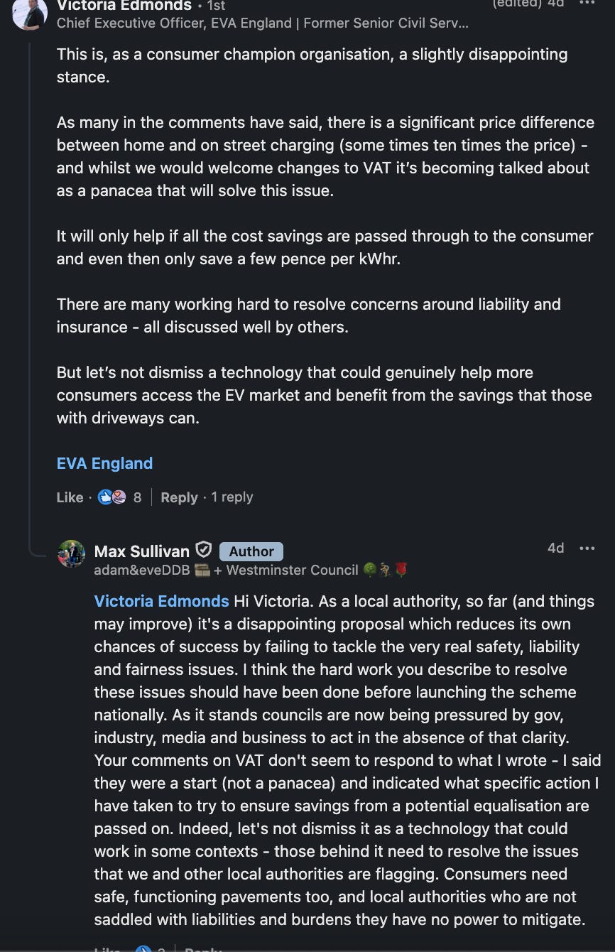 As you can imagine, this went down badly amongst many in the industry. Vicky Edmonds, CEO of EVA England, commented underneath the post saying it was a “disappointing stance” and asked that the technology not be ruled out, due to risks around liability being worked on.